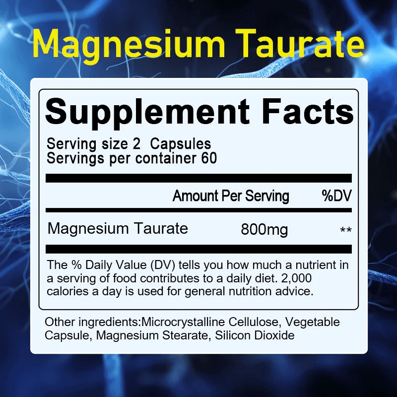 Powerful Magnesium Taurine Capsules – Comprehensive Support for Heart, Energy, and RelaxationBoost your health with Powerful Magnesium Taurine Capsules, expertly formulated to enhance cardiovascular function, sustain energy, and support relaxation. This powerful duo of magnesium and taurine provides targeted support for overall wellness, making it an essential addition to your daily routine.Key Features:Heart Health Support: Magnesium and taurine work together to promote healthy blood pressure, improve circulation, and support overall cardiovascular health.Energy and Muscle Function: Magnesium plays a vital role in energy production and muscle function, making these capsules perfect for anyone with an active lifestyle.Promotes Calm and Relaxation: Taurine has natural calming properties that, combined with magnesium, help to reduce stress and support mental clarity.High Bioavailability: Formulated for optimal absorption, ensuring your body gets the most out of each capsule.Convenient and Easy to Take: Simple capsule form makes it easy to incorporate into your daily routine, with precise dosing to meet your needs.Non-GMO and Free from Allergens: Made with non-GMO ingredients and free from common allergens like gluten, dairy, and soy for safe, effective supplementation.Benefits:Supports Cardiovascular Health: Combines magnesium and taurine to help maintain healthy blood pressure and improve blood flow, supporting a healthy heart.Boosts Energy Naturally: Magnesium is crucial for energy production, reducing fatigue and enhancing endurance, especially during physical activity.Aids in Stress Management: Supports relaxation and reduces muscle tension, making it easier to manage stress and maintain mental well-being.Enhances Sleep Quality: Known to support better sleep, magnesium and taurine promote restful nights and balanced mood.Easy Daily Wellness Solution: Perfect for on-the-go individuals who want a natural, all-in-one solution to maintain health and wellness.